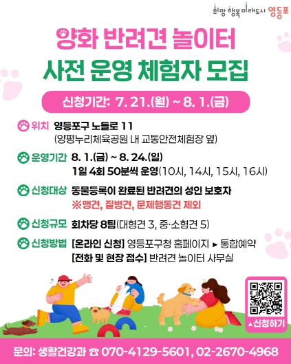 체험단 신청 대상은 동물 등록을 마친 반려견과 성인 보호자이다. 신청은 7.21.~8.1.까지 영등포구 누리집(홈페이지) ‘통합예약 → 모집접수’ 메뉴를 통해 온라인으로 가능하며, 평일 오전 9시부터 오후 6시까지는 전화나 현장 접수도 받을 예정이다.