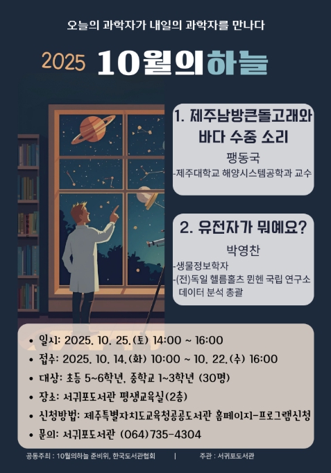 [뉴스시대=김정희 기자] 제주도교육청 서귀포도서관은 25일 오후 2시부터 서귀포도서관 평생교육실에서 한국도서관협회 및 ‘10월의 하늘’ 준비위원회와 함께 ‘10월의 하늘’ 프로그램을 운영한다.