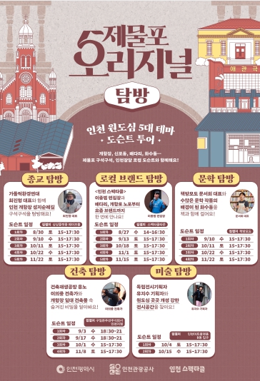 [뉴스시대=김정희 기자] 인천광역시와 인천관광공사(사장 백현)는 오는 8월 27일부터 11월까지 매주 수요일과 토요일 인천 개항장과 배다리 등 원도심을 코스로 한 ‘제물포 오리지널 탐방’을 운영한다고 밝혔다.