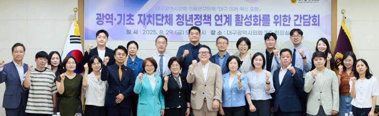 [뉴스시대=김정희 기자] 대구시의회 의원연구단체 ‘대구미래혁신포럼’은 8월 29일, 의회 3층 회의실에서 시·군·구 청년정책 관계자들과 함께 '광역·기초 자치단체 청년정책 연계 활성화를 위한 간담회'를 개최했다.