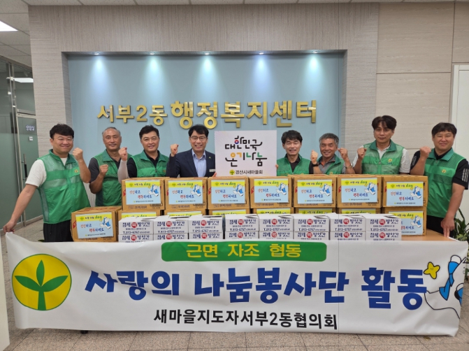 [뉴스시대=김정희 기자] 새마을지도자서부2동협의회(회장 채효식)는 2일 ‘사랑의 나눔봉사단 활동'을 통해 관내 취약계층 15가구에 라면 1박스와 떡 1박스를 전달하며 따뜻한 나눔을 실천했다.