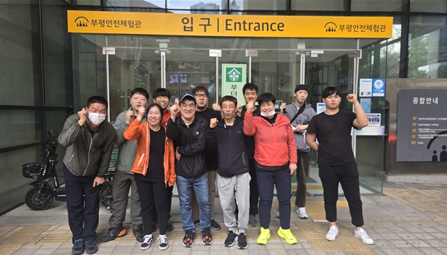 ▲ 해내기보호작업장 이용 장애인과 종사자들이 지난 15일 부평안전체험관을 방문하고 기념 촬영을 하고 있다. |