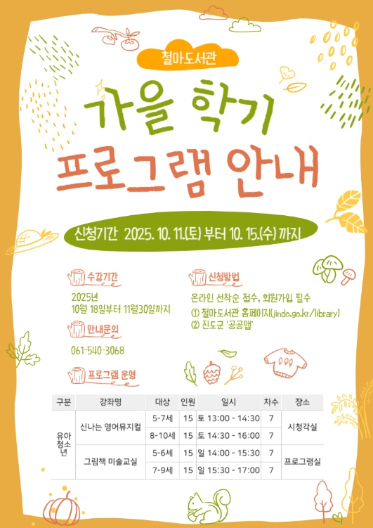 진도군 철마도서관 관계자는 “이번 가을학기 프로그램을 통해 아이들이 즐겁게 배우고 소통하는 시간을 갖길 바란다”라고 말했다.