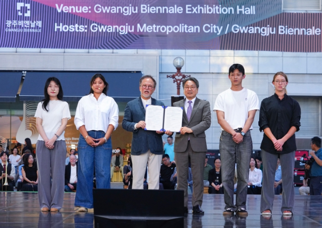 [뉴스시대=김정희 기자] 강기정 광주광역시장이 29일 오후 북구 광주비엔날레 광장 특설무대에서 열린 '2025 광주디자인비엔날레' 개막식에 참석해 국내·외 학생들로부터 광주포용디자인 매니페스토 선언서를 전달 받았다.